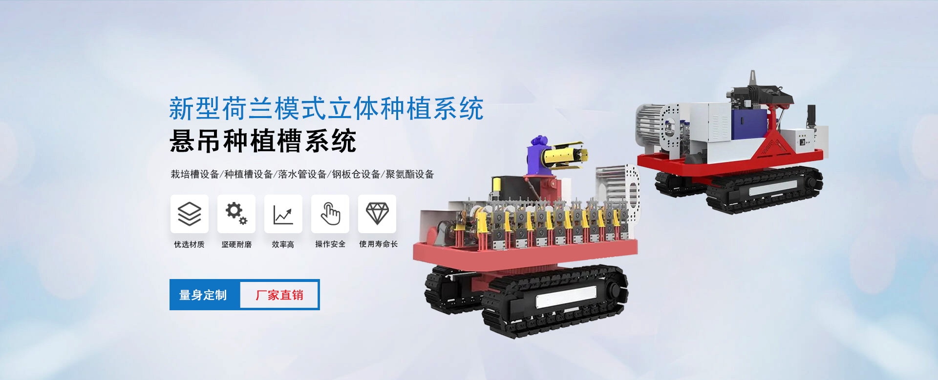雄博機械主營:種植槽設備/栽培槽設備/草莓栽培槽/新型立體種植槽/草莓無土栽培設備/草莓立體種植系統/懸吊種植槽系統/落水管設備/鋼板倉設備/聚氨酯設備等。